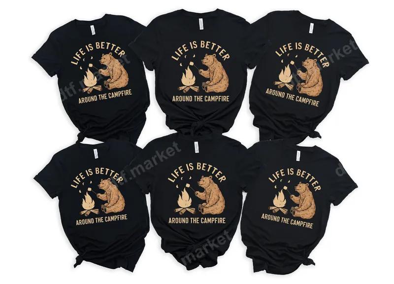 See allThis charming "Life is Better Around the Campfire" DTF transfer captures the cozy essence of the great outdoors. Featuring a friendly bear happily roasting a marshmallow over a crackling campfire, this design evokes warmth, relaxation, and adventure. It's a perfect ready to press graphic for anyone who loves camping, s'mores, and starlit nights. Ideal for campers, hikers, nature lovers, and outdoor enthusiasts, this delightful heat transfer makes a fantastic gift for family and friends. Perfect for camping trips, glamping adventures, RV vacations, or simply cozy nights by the fire pit in your backyard. Create matching t-shirts for your next family reunion, scouting event, or wilderness retreat. Our premium DTF transfer is incredibly versatile and easy to apply to almost any fabric type, including cotton, polyester, and various blends. Achieve professional results using a heat press set at 300-325°F for just 15 seconds with medium pressure. For hobbyists, a household iron can also be used. Forget the hassle of weeding vinyl; this iron on transfer comes ready for instant application onto your chosen garment. Crafted with the highest quality DTF film, this durable t-shirt transfer ensures vibrant colors that pop and remain brilliant wash after wash. The design is crack-resistant and boasts a soft, lightweight feel, making it comfortable to wear. Experience the convenience and professional finish of our robust apparel transfer, designed to last and impress.