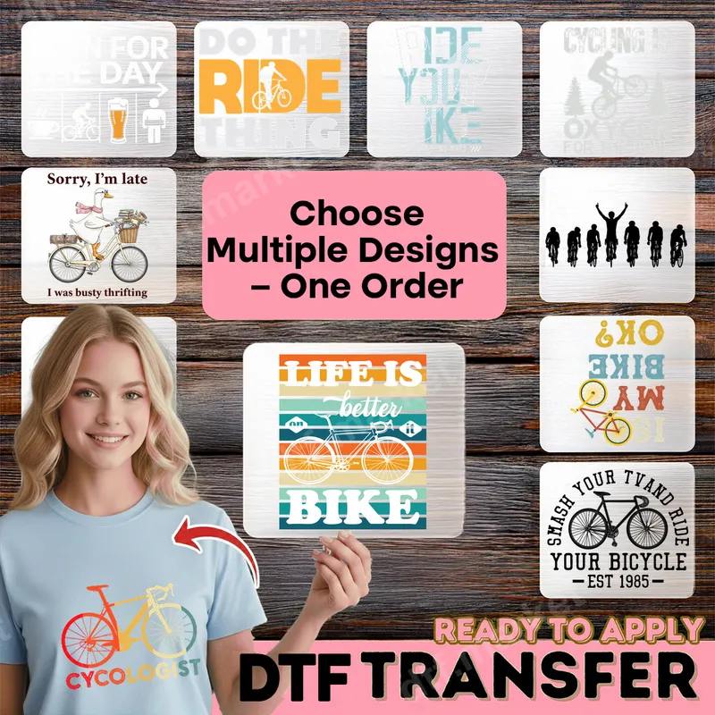 See allShow your love for two-wheeled adventures with our 'Life is Better on a Bike' DTF transfer. This eye-catching heat press design features a classic bicycle silhouette set against a vibrant, retro-inspired sunset stripe background. It’s a perfect ready to press transfer for anyone who finds joy and freedom on their bike, making it an ideal choice for quick and easy customization. Designed for avid cyclists, casual riders, and outdoor enthusiasts, this unique shirt design is perfect for personalizing t-shirts, hoodies, and jackets. Whether you're heading out for a leisurely ride, attending a bike event, or simply enjoying a casual day out, this heat transfer adds a touch of personality. It also makes a fantastic gift for birthdays, Fathers Day, or any special occasion for the bike lover in your life. Applying this DTF transfer is straightforward and hassle-free. It works seamlessly on a wide range of fabric types, including cotton, polyester, and various blends. For best results, use a heat press at 300-325°F for 15 seconds with medium pressure. Even a standard household iron can achieve great results, allowing you to create custom apparel with professional flair. No tedious weeding or layering required, just press and peel! Experience superior quality with our durable direct to film transfers. Each transfer boasts vivid colors, excellent wash durability, and a soft-to-touch finish that won't crack or fade over time. Made with professional-grade DTF film and strong adhesive, your customized garments will look fantastic and last for countless rides. Elevate your wardrobe with this stylish and fun iron on transfer.