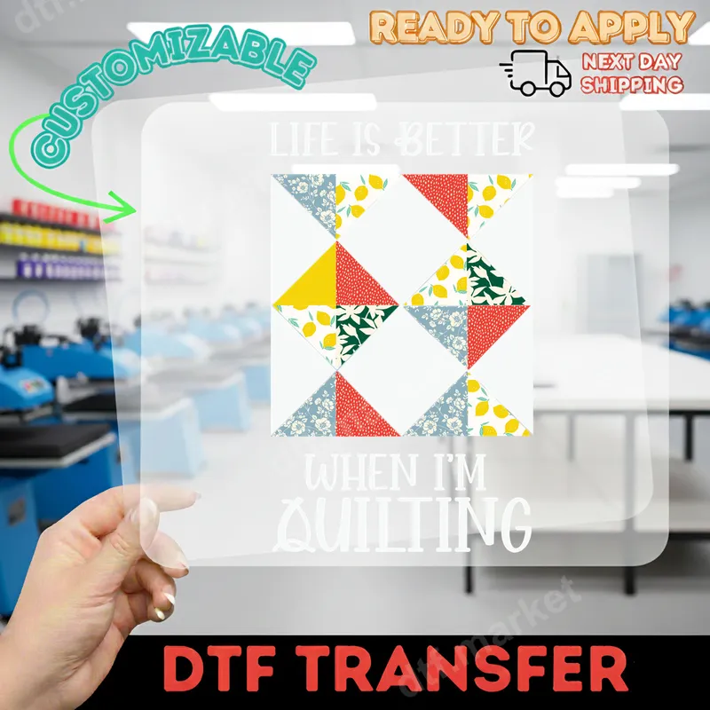 See allCelebrate your love for fabric arts with our 'Life Is Better When I'm Quilting' DTF transfer. This delightful design features a classic patchwork quilt block, meticulously crafted with various vibrant patterns like cheerful lemons, dainty florals, and bold solids. It's a perfect visual representation of the joy and creativity found in quilting. This high-quality DTF transfer is ready to press, allowing you to quickly personalize your apparel and accessories with your favorite hobby. This charming heat press design is ideal for passionate quilters, sewing enthusiasts, craft club members, and anyone who finds peace and happiness in their quilting projects. It makes a thoughtful gift for Mother's Day, birthdays, Christmas, or as a special treat for grandmothers, aunts, or friends who cherish their quilting time. Imagine this unique iron on decal on a custom shirt for your next quilt retreat or craft fair. Applying this ready to press transfer is incredibly easy, designed for both professional heat press machines and household irons. It adheres beautifully to a wide range of fabrics, including cotton, polyester, and various blends. For best results, use a heat press at 300-325°F for 15 seconds with medium pressure, then peel cold. No weeding, no layering – just a flawless t-shirt transfer every time. Our premium direct to film transfers are known for their exceptional quality. You'll love the vibrant colors, crisp details, and soft, comfortable feel of the finished product. Each heat transfer is printed on professional-grade DTF film with a strong adhesive that ensures your design will be crack-resistant, durable, and last wash after wash, maintaining its beautiful appearance for years to come.