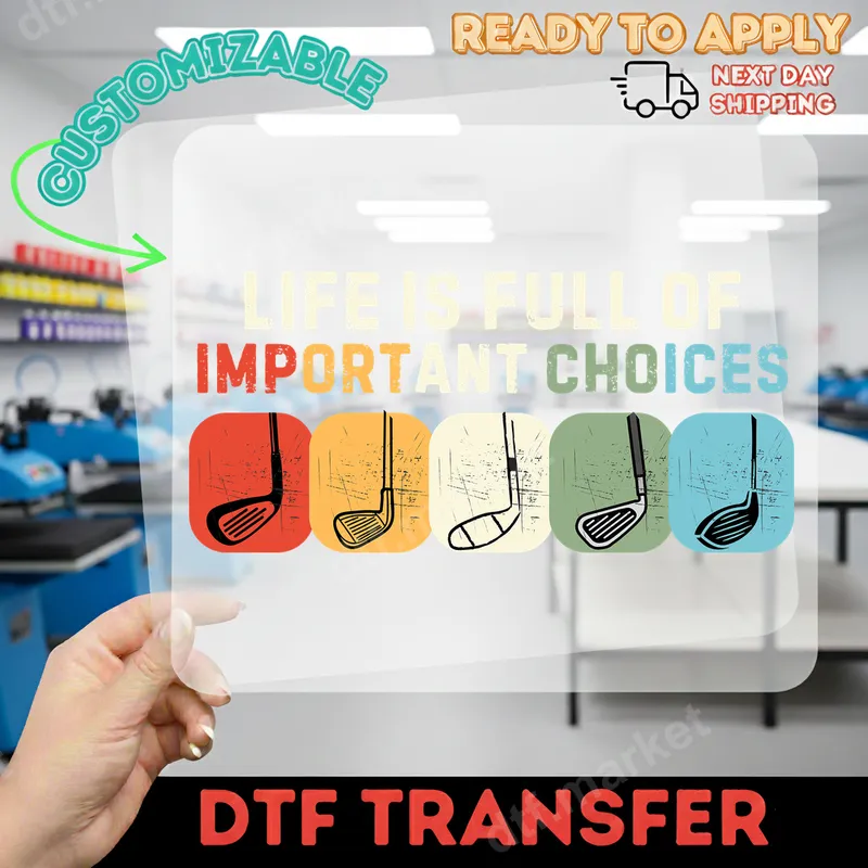 See allThis vibrant DTF transfer features a witty design that reads "LIFE IS FULL OF IMPORTANT CHOICES," humorously paired with a lineup of various golf clubs. The distressed, retro-style graphics in muted, earthy tones—red, orange, cream, green, and blue—add a cool vintage vibe to this ready to press transfer. It's an eye-catching statement piece perfect for anyone who understands the true priorities on the green. This unique heat transfer is ideal for golf enthusiasts, professional golfers, casual players, and anyone who appreciates a good golf-themed joke. It makes a fantastic gift for Father's Day, birthdays, golf tournaments, or as a fun addition to a golf league uniform. Whether you're hitting the links or just dreaming of them, this design adds personality to any garment. Applying this heat press design is straightforward and professional. It works beautifully on a wide variety of fabric types, including cotton, polyester, and their blends. For best results, use a heat press at 300-325°F for 15 seconds with medium pressure, then cold peel. For smaller projects or home use, a household iron can also be used. No tedious weeding is required, making your customization process quick and easy. Crafted from high-quality direct to film transfer materials, this iron on transfer ensures a durable, crack-resistant finish that feels soft to the touch. The colors remain vibrant wash after wash, maintaining its professional look. Elevate your apparel with a premium t-shirt transfer that stands out and truly lasts.