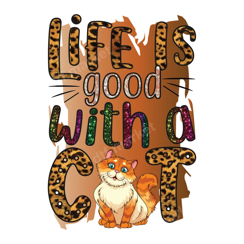 See allThe "Life Is Good With A Cat" DTF transfer brings a purr-fectly charming and playful design to your apparel projects. This eye-catching ready to press transfer features the phrase in a mix of stylish leopard print and vibrant, sparkling glitter textures. An adorable orange tabby cat sits playfully among the letters, adding a sweet touch that every cat enthusiast will adore. It’s an ideal way to express your love for cats with a touch of fun and flair. This charming heat press design is perfect for devoted cat parents, feline enthusiasts, and anyone who understands the joy a cat brings to life. It makes an excellent personalized gift for birthdays, Mother's Day, Christmas, or just because. Create custom shirts for yourself, friends, or family to wear to pet adoption events, casual outings, or simply while relaxing at home with your beloved pet. It's a fantastic way to showcase your pet pride. Applying this versatile DTF transfer is straightforward and hassle-free. Our high-quality ready to press transfer works beautifully on a wide variety of fabrics, including cotton, polyester, and cotton/poly blends. For best results, use a heat press at 300-325°F for 15 seconds with medium pressure. It can also be applied with a household iron, following included instructions. Best of all, there's no weeding or layering required, making customization quick and easy. Experience superior quality with our professional-grade direct to film transfers. Each t-shirt transfer is known for its vibrant colors, exceptional durability, and soft feel, ensuring your design remains crack-resistant and maintains its brilliance wash after wash. The strong adhesive ensures a lasting bond with your garment, creating a professional-looking apparel transfer every time. Elevate your wardrobe or gift unique creations with these premium iron on decals from dtf.market.
