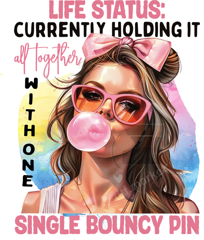 See allEmbrace your 'Life Status' with this vibrant DTF transfer featuring a sassy, stylish woman blowing a bubblegum bubble. The design humorously captures navigating life's challenges with the quote: 'LIFE STATUS: CURRENTLY HOLDING IT all together WITH ONE SINGLE BOUNCY PIN.' This eye-catching graphic, set against a colorful background, offers a blend of humor and chic appeal, perfect for a statement piece. It’s a high-quality, ready to press design that adds personality to any fabric. This design is ideal for independent women, busy moms, girlfriends, or anyone who appreciates sassy realism and a great sense of humor. It makes a fantastic gift for birthdays, Mother's Day, Galentine's Day, or just because. Create custom apparel with this unique t-shirt transfer for a girls' trip, or personalize a hoodie for a friend. This humorous design is sure to resonate and bring smiles. Applying this versatile heat transfer is straightforward. Our premium transfers work seamlessly on cotton, polyester, and blends, across all colors. For best results, use a heat press at 300-325°F for 15 seconds with medium pressure, then peel cold. A household iron can also be used with careful application. There’s absolutely no weeding or layering required, simplifying your customization. You’ll love the professional quality of our DTF prints. Each iron on boasts vibrant colors that pop, exceptional wash durability, and resistance to cracking or peeling, ensuring your design looks fantastic for years. The transfers feature a soft hand feel that integrates seamlessly with the fabric, providing comfortable wear. Crafted with professional-grade DTF film and strong adhesive, this decoration delivers a premium finish every time.