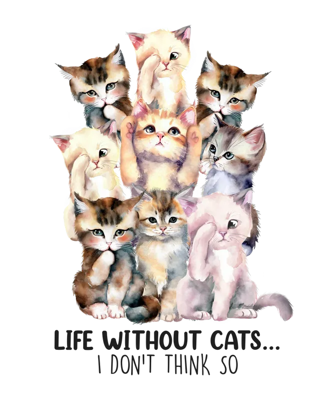 See allThis delightful "Life Without Cats... I Don't Think So" design features an endearing cluster of watercolor kittens, each expressing a charming level of dismay at the mere thought of a cat-less existence. It’s a whimsical and heartfelt statement for anyone who cherishes their furry friends. This high-quality DTF transfer is an instant mood-lifter, offering a vibrant and detailed image that’s completely ready to press onto your favorite fabric items. Perfect for devoted cat parents, feline enthusiasts, or anyone who appreciates a good dose of animal humor, this iron on transfer makes an excellent gift for birthdays, Mother's Day, or just because. It’s ideal for creating personalized apparel, whether you're designing a custom t-shirt transfer for a friend, a hoodie for yourself, or a tote bag for a fellow cat lover. Show off your love for cats at casual gatherings, pet events, or simply in your everyday life. Applying this design is a breeze, making it a truly heat press ready solution for crafters and businesses alike. Our premium direct to film transfer works beautifully on a wide range of materials, including cotton, polyester, and various blends. For best results, use a heat press at 300-325°F for 15 seconds with medium pressure, then cold peel the film. You can even use a household iron with care. The best part? No tedious weeding is required, saving you time and effort. You'll be impressed by the professional quality of this apparel transfer. The colors are incredibly vibrant, the design is highly crack-resistant, and the finished print offers a wonderfully soft, almost seamless feel on the fabric. Crafted using professional DTF film and strong adhesive, this heat press design ensures durability and longevity, allowing your message to last wash after wash without fading or peeling.