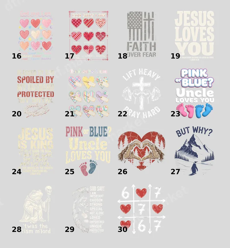 Premium DTF transfer designs for every occasion. From streetwear to faith-inspired art, we create heat press ready designs that make your garments stand out.