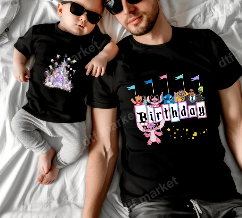See allThis cheerful DTF transfer features everyone's favorite alien, Stitch, alongside Lilo, Angel, Jumba, and Pleakley, celebrating a birthday! The vibrant design showcases the beloved Lilo & Stitch characters holding colorful flags above the word "Birthday," with an adorable Angel front and center, surrounded by sparkling stars and hearts. This ready to press transfer brings a playful and festive touch, perfect for any fan looking to add a unique, animated flair to their apparel. Ideal for Disney enthusiasts and Lilo & Stitch fans of all ages, this heat press design is perfect for birthday parties, family gatherings, or as a special gift for a loved one. Create matching birthday shirts for the whole family, design custom party favors, or surprise the birthday star with a personalized garment featuring their favorite characters. It's also a fantastic way for small businesses to offer trending, high-quality apparel transfers to their customers. Applying this Lilo & Stitch iron on transfer is simple and hassle-free. Our direct to film transfers adhere beautifully to cotton, polyester, and blends. For best results, use a heat press at 300-325°F for 15 seconds with medium pressure, then a warm peel. No intricate weeding or layering is required, making it a quick and easy way to customize shirts, bags, or other textiles with professional-grade results, even for those using a household iron. Crafted using premium DTF film and high-quality inks, this shirt design delivers exceptional vibrancy and durability. The colors pop, remaining bright and true wash after wash, without cracking or fading. The transfer is incredibly soft to the touch, ensuring comfort when worn, and boasts strong adhesive for long-lasting wear. Elevate your apparel with a professional-grade heat transfer that feels as good as it looks.
