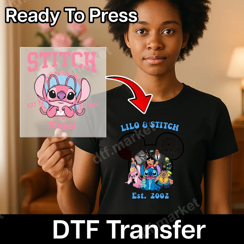 See allThis vibrant DTF transfer showcases the beloved Lilo & Stitch ohana, featuring Lilo, Stitch, Angel, and other iconic characters nestled within a playful Mickey Mouse head silhouette, marked "Est. 2002." The design captures the heartwarming spirit of the Disney movie, presented in bright, cheerful colors. It’s a fantastic ready to press transfer that brings island magic and nostalgia to any garment, making customization effortless and fun. This charming heat transfer is perfect for Disney fans of all ages, especially those who adore Lilo & Stitch. It’s an ideal choice for family vacations to theme parks, birthday parties, or simply to express your love for the mischievous alien and his human best friend. Use this design to create unique gifts for friends, customize matching shirts for a group trip, or add a personal touch to your everyday apparel. Applying this Lilo & Stitch design is incredibly simple. This heat press ready design works beautifully on a wide variety of materials, including cotton, polyester, and their blends. For best results, use a heat press at 300-325°F for 15 seconds with medium pressure. A household iron can also be used with firm, even pressure. Unlike traditional vinyl transfer, there's no weeding required, saving you time and effort. Just press and peel! Our premium direct to film transfer ensures a professional, high-quality finish every time. The colors are incredibly vibrant and durable, designed to resist cracking and fading even after many washes. The advanced DTF film provides a soft, flexible feel that seamlessly integrates with the fabric, ensuring maximum comfort. You’ll love the long-lasting quality and exceptional detail of this apparel transfer, making your custom creations stand out.