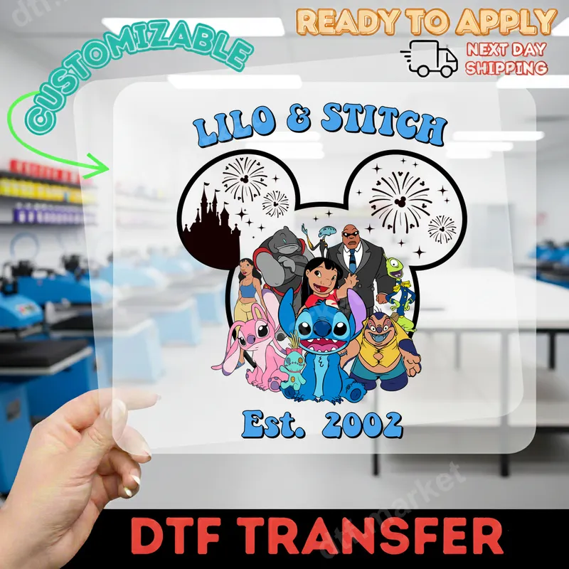 See allThis vibrant DTF transfer captures the beloved Lilo & Stitch Ohana, featuring Stitch, Lilo, Angel, Jumba, Pleakley, and other fan-favorite characters gathered within a playful Mickey Mouse head outline. The iconic "LILO & STITCH" title and "Est. 2002" nod to the film's release, making this a nostalgic and charming design. It's a ready to press transfer, bringing the magic of Hawaii and intergalactic friendship directly to your garments with vivid colors and intricate details. Perfect for Disney fans of all ages, this heat press transfer is ideal for family vacations to theme parks, movie nights, birthday parties, or everyday wear to show off your love for Experiment 626. It makes a fantastic gift for Lilo & Stitch enthusiasts, crafters looking for unique apparel transfers, or anyone wanting to add a touch of playful aloha to their wardrobe. Create matching family shirts or personalized accessories effortlessly. Our high-quality DTF transfers are incredibly versatile and work beautifully on a wide range of fabrics, including 100% cotton, polyester, and cotton/poly blends. Applying this iron on design is simple with either a heat press (recommended: 300-325°F for 15 seconds with medium pressure) or a household iron. Unlike traditional vinyl transfers, there's absolutely no weeding required, saving you time and effort for a professional finish. Experience superior quality with our direct to film transfers. Each design boasts vibrant colors that pop, exceptional wash durability, and is crack-resistant, ensuring your customized apparel looks great for years to come. The soft-touch feel integrates seamlessly with your fabric, providing a comfortable and professional finish. Made with premium DTF film and strong adhesive, this apparel transfer delivers reliable results every time.
