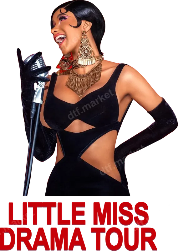 See allThis vibrant DTF transfer showcases a glamorous, vintage-inspired singer in a black cutout dress, holding a classic microphone, with the bold red text "LITTLE MISS DRAMA TOUR." Capturing a playful, theatrical, and sassy vibe, this ready to press design is perfect for those who embrace their dramatic flair and love making a statement. This "Little Miss Drama Tour" heat transfer is ideal for pop culture enthusiasts, meme lovers, and anyone with a flair for the dramatic and a sense of humor. It’s perfect for personalizing your wardrobe for concerts, music festivals, themed parties, or simply making a statement in everyday wear. It also makes a fantastic, unique gift for friends, family, or fellow drama queens. Applying this versatile ready to press transfer is incredibly simple. It adheres beautifully to cotton, polyester, and various blends. For optimal results, use a heat press at 300-325°F for 15 seconds with medium pressure, then cold peel. A household iron can also be used. Enjoy a seamless application process with no weeding required, unlike vinyl transfers. Experience superior quality with this direct to film transfer. Each design is printed with vibrant, long-lasting colors that resist cracking and fading, ensuring your custom creation stays stunning wash after wash. The professional-grade DTF film provides a soft, flexible feel, and its strong adhesive ensures a durable bond, making your custom shirt design a standout piece.
