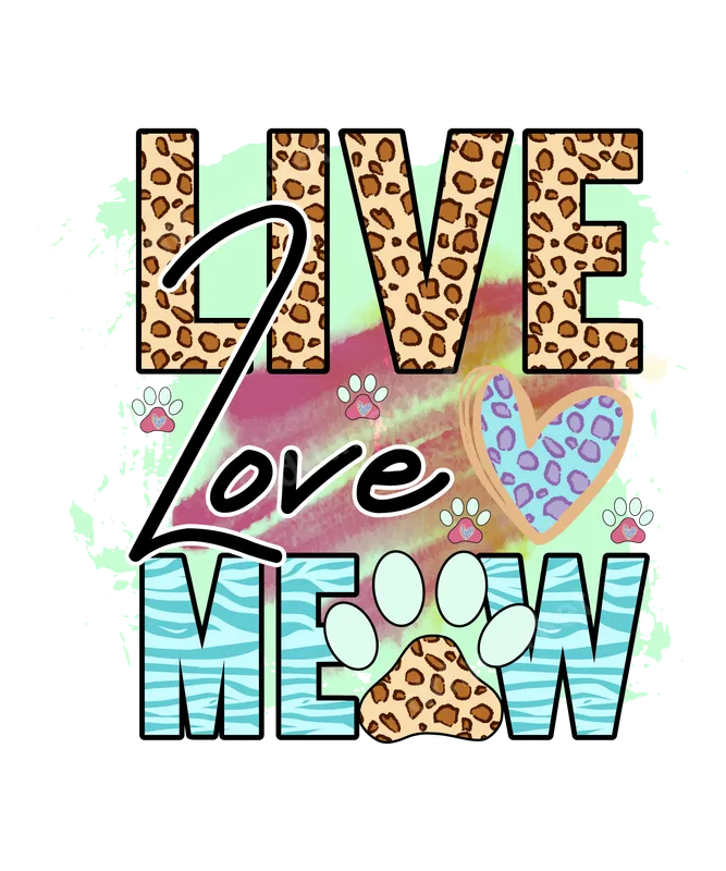 See allThis charming DTF transfer features the playful phrase "LIVE Love MEOW" with a vibrant, mixed-media aesthetic. The word "LIVE" is adorned with a stylish leopard print, while "MEOW" showcases a cool zebra stripe pattern in light blue. The cursive "Love" ties the sentiment together. Subtle watercolor brushstrokes in pastel green, pink, and yellow create a dynamic background, complemented by cute paw prints and a heart shape with coordinating animal print. This ready to press design brings a trendy, affectionate vibe perfect for any animal enthusiast. Designed for devoted cat moms, pet owners, and anyone who adores feline friends, this unique iron on transfer is ideal for expressing your love for cats. It makes a fantastic gift for birthdays, Mother's Day, or just because, for friends and family who cherish their furry companions. Use this apparel transfer to create custom gifts for your fellow cat rescue volunteers, vet techs, or simply to add a touch of personality to your everyday wear. Applying this heat press transfer is incredibly simple, making it perfect for both beginners and experienced crafters. It adheres beautifully to a wide range of fabrics, including 100% cotton, 100% polyester, and various cotton/poly blends. For best results, use a heat press at 300-325°F for 15 seconds with medium pressure, then cold peel. A household iron can also be used following detailed instructions. Enjoy the convenience of a ready to press design with no tedious weeding or layering required, just press and wear! Our direct to film transfers are crafted using premium DTF film and inks, ensuring exceptional durability and a professional finish. You’ll love the vibrant colors that pop and resist cracking, peeling, or fading, even after multiple washes. The final design feels incredibly soft to the touch, seamlessly integrating with the fabric of your chosen garment. Experience the superior quality of a commercial-grade t-shirt transfer that’s built to last and impress.