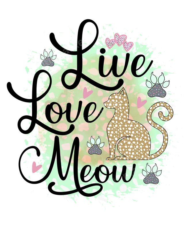 See allThis charming DTF transfer features the playful phrase "Live Love Meow" in elegant black script, centered around a stylish, spotted cat silhouette. The design is complemented by adorable paw prints and delicate pink hearts, all set against a soft, mint green and blush pink watercolor-style background with a subtle distressed edge. This design exudes a cute, loving, and slightly sassy vibe, making it a perfect ready to press statement for any cat enthusiast. Ideal for devoted cat mothers, proud pet parents, or anyone who adores their feline companions, this design is fantastic for casual wear, pet-themed events, or as a thoughtful gift. It’s perfect for birthdays, Mother’s Day, or just to show off your love for cats year-round. Create custom apparel for rescue events, vet clinic staff, or simply for everyday comfort and style. This iron on transfer is a must-have for showcasing your kitty pride. Our versatile heat transfer designs are compatible with a wide range of fabrics, including cotton, polyester, and various blends, ensuring crisp application on almost any garment. For best results, apply with a heat press at 300-325°F for 15 seconds with medium pressure, then peel cold. A household iron can also be used with careful, even pressure. Enjoy the convenience of a "no weeding" design, making application quick and easy with this high-quality heat press ready transfer. Experience superior quality with our DTF transfers. Each design boasts vibrant colors, excellent wash durability, and is engineered to be crack-resistant, ensuring your customized apparel looks great for longer. The professional DTF film provides a soft hand feel and features a strong adhesive that adheres securely to your chosen textile. Elevate your wardrobe with a durable and beautiful shirt design that truly stands out.