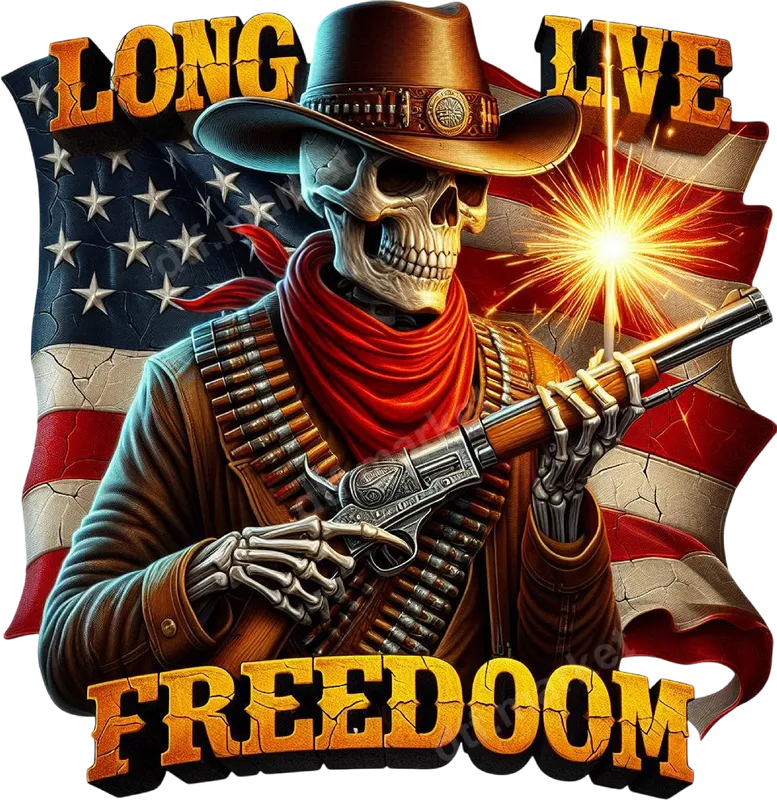 See allThis bold DTF transfer features a striking skeleton cowboy, adorned with a classic western hat, red bandana, and a bandolier of bullets, holding a formidable shotgun. Behind him, a distressed American flag waves proudly, illuminated by sparks, while the powerful message "LONG LIVE FREEDOM" frames the design in a weathered, cracked font. This high-quality, ready to press DTF transfer captures a unique blend of rugged patriotism and edgy style, perfect for making a statement. Ideal for patriots, veterans, gun enthusiasts, and anyone who cherishes American freedom and a distinct western aesthetic. This heat transfer makes an excellent personalized gift for Fathers Day, Independence Day, Veterans Day, or birthdays for friends and family who appreciate unique patriotic apparel. Showcase your beliefs and style at rallies, casual outings, or everyday wear. Our iron on transfers are incredibly easy to apply to almost any fabric type, including cotton, polyester, and various blends. For best results, use a heat press at 300-325°F for 15 seconds with medium, even pressure. This shirt design can also be applied with a household iron (follow included instructions for iron-on transfers). No weeding or complex preparation is required, making customization quick and simple. Experience vibrant colors, exceptional durability, and a soft-to-the-touch finish with our premium direct to film transfer. Each heat press design is printed on professional-grade DTF film, ensuring crisp details and strong adhesion that resists cracking, peeling, and fading wash after wash. Elevate your apparel with a long-lasting, professional-quality print.