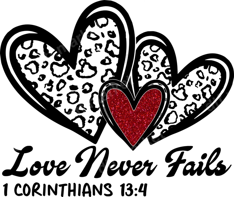 Love Never Fails 1 Corinthians 13:4 Scripture Hearts DTF Transfer