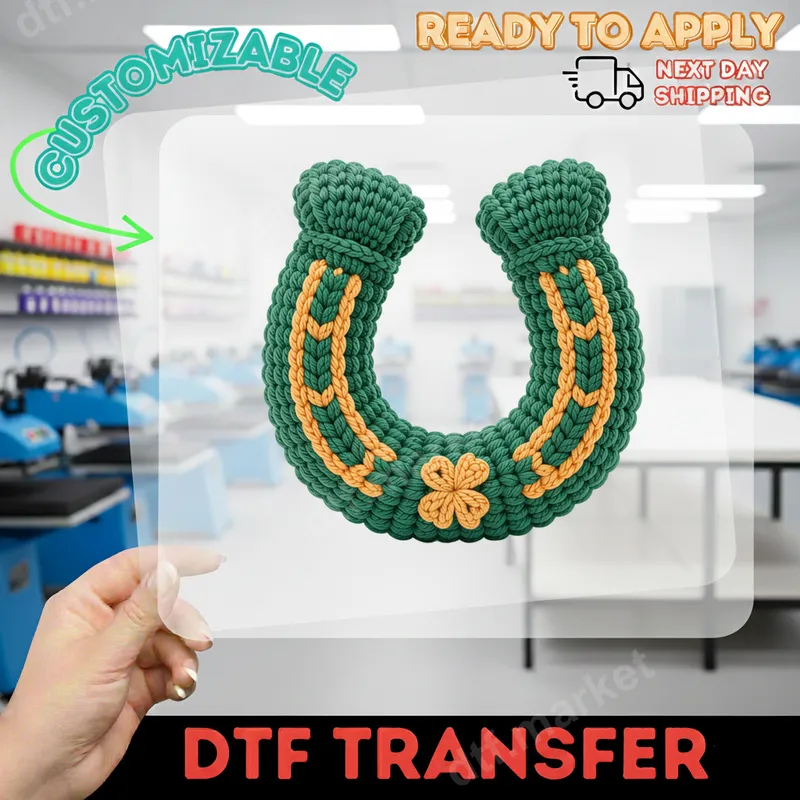 See allEmbrace charm and good fortune with our unique Knitted Horseshoe Shamrock DTF Transfer. This delightful design showcases a robust green knitted horseshoe, intricately detailed with orange-gold accents mimicking a braided pattern, featuring a sweet four-leaf clover at its base. It evokes a cozy, handcrafted feel, perfect for adding rustic luck to any item. This high-quality DTF transfer is ready to press, allowing you to quickly customize apparel. This lucky heat press transfer is ideal for celebrating St. Patrick's Day or adding everyday good luck. It's a fantastic personalized gift for crafters, horse enthusiasts, or anyone appreciating charming, folk-inspired designs. Use for festive gatherings, unique gifts, or bespoke small business items. Its versatile appeal suits many ages and styles, making it a popular choice. Applying this ready to press transfer is simple and efficient. It adheres beautifully to cotton, polyester, and blends, perfect for almost any fabric. For best results, use a heat press at 300-325°F for 15 seconds with medium pressure. A household iron can also be used. No weeding is required, saving valuable time and effort on every heat press design. Our direct to film transfers use professional-grade DTF film and inks, ensuring exceptional durability and a vibrant finish. Colors remain brilliant wash after wash, resistant to cracking and peeling, maintaining a pristine look. You'll love the soft, flexible feel of this iron on decal, integrating seamlessly into fabric without heavy texture. Trust dtf.market for premium quality apparel transfers that truly stand out.