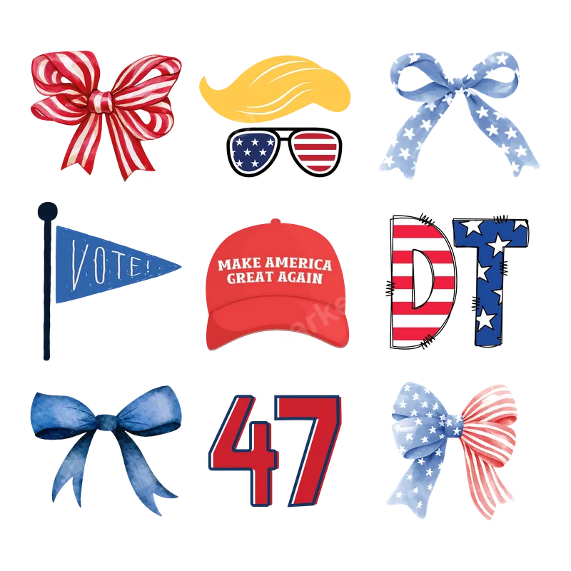 See allThis vibrant direct to film (DTF) transfer pack features a collection of patriotic and political designs centered around support for the 47th President. You'll find iconic elements such as a "MAKE AMERICA GREAT AGAIN" hat, a stylized blonde hair and sunglasses motif, the initials "DT" in American flag patterns, and the significant number "47." Completing the theme are various red, white, and blue bows, alongside a "VOTE!" pennant, all rendered in a clean, ready to press watercolor-inspired style. It’s perfect for expressing your political stance with clear, bold graphics. This collection of heat press ready designs is ideal for supporters looking to personalize their apparel for political rallies, campaign events, or patriotic holidays like the 4th of July and Election Day. It's a fantastic choice for individuals who want to show their enthusiasm for the MAGA movement and the upcoming 2024 election. Crafters and small businesses can utilize these custom transfers to create unique merchandise for fellow supporters, making them excellent gifts for politically-minded friends and family members. Applying these high-quality DTF transfers is incredibly straightforward, working seamlessly on a wide range of fabrics including cotton, polyester, and various blends. For best results, use a heat press at 280-300°F for 6-10 seconds with medium pressure, then perform an instant hot peel. While a professional heat press is recommended for durability, these iron on transfers can also be applied with a household iron with careful technique. Enjoy the convenience of a ready to press design with no tedious weeding or layering involved, saving you time and effort. Crafted using professional-grade DTF film, these apparel transfers boast incredibly vibrant colors and sharp details that truly stand out. The durable, crack-resistant print maintains its integrity wash after wash, ensuring your design looks fresh for a long time. With a soft-to-touch finish and strong adhesive, the transfer integrates smoothly into the fabric, providing a comfortable feel. These top-tier direct to film transfers deliver professional results every time, making your custom garments look store-bought.