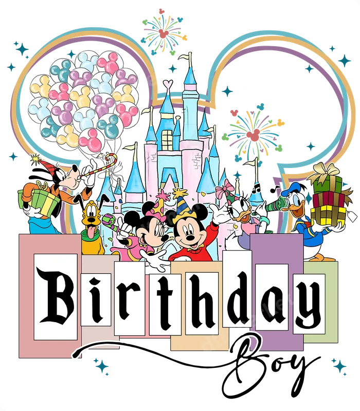 See allThis enchanting DTF transfer celebrates a special "Birthday Boy" with an iconic magical castle backdrop, surrounded by beloved cartoon characters like Mickey, Minnie, Donald, Daisy, Goofy, and Pluto. Festive balloons shaped like mouse ears and colorful fireworks add to the joyful atmosphere, making this design a truly magical ready to press heat transfer for any celebration. The vibrant colors and playful illustrations capture the wonder and excitement of a birthday, perfect for creating memorable garments. Perfect for crafting unique birthday outfits, this heat press design is ideal for parents, grandparents, and gift-givers looking to personalize apparel for a child's big day. It's fantastic for birthday parties, family trips to theme parks, or as a special custom transfer gift. Surprise the birthday boy with a unique garment that features his favorite characters in a festive setting, making his celebration even more special and magical for everyone. Applying this premium DTF transfer is quick and easy. Our durable heat press transfer works flawlessly on a wide range of materials, including 100% cotton, polyester, cotton/poly blends, and even denim. For best results, apply with a heat press at 300-325°F for 15 seconds with medium pressure, then cold peel. For smaller projects, a household iron on transfer can also be used following careful instructions. Enjoy a professional finish with no weeding or layering required, making customization effortless! Experience exceptional quality with our professional-grade apparel transfer. This t-shirt transfer boasts incredibly vibrant colors that pop, ensuring your design looks stunning and lasts. It's designed to be crack-resistant, fade-resistant, and incredibly soft to the touch, feeling like part of the fabric itself. Our DTF film features a strong adhesive for superior wash durability, providing a long-lasting, high-quality garment transfer that will be cherished for years to come.