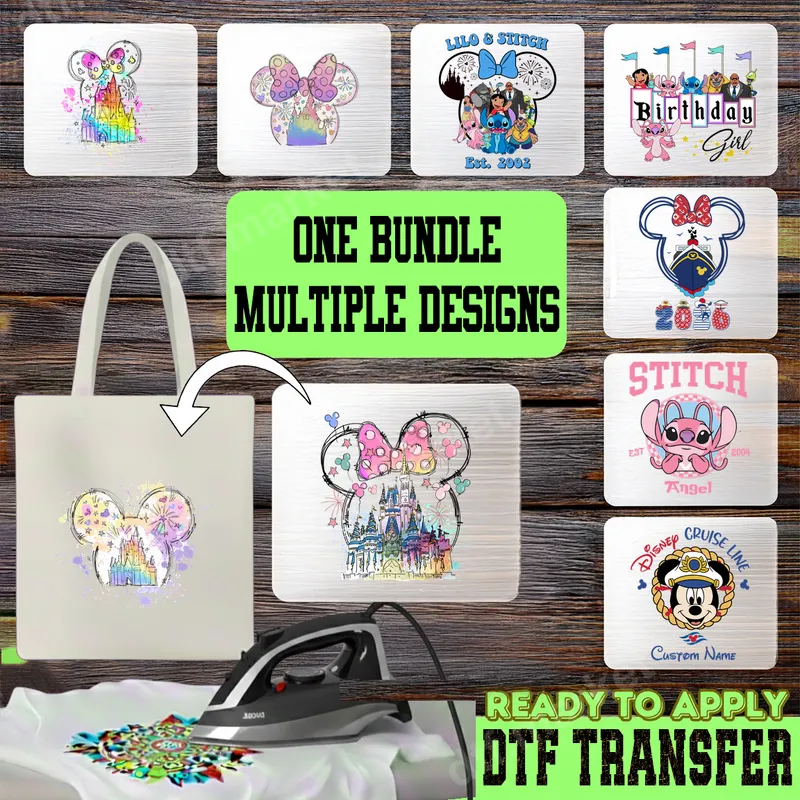 See allThis vibrant bundle offers a collection of Disney-inspired DTF transfers, perfect for adding a touch of magic to your apparel. Featuring iconic elements like Mickey and Minnie Mouse ears, Cinderella's castle rendered in a beautiful watercolor splash style, and beloved characters Stitch and Angel, these ready to press designs capture the joy and whimsy of a Disney adventure. Each heat press transfer in this pack is designed to bring smiles and celebrate the enchantment of classic animated stories. This versatile collection is ideal for Disney fans of all ages, perfect for family vacation shirts, birthday celebrations (especially with the "Birthday Girl" design), or cruise line trips where you can customize with "Disney Cruise Line" and a custom name. Whether you're planning a trip to the theme parks, hosting a themed party, or simply want to express your love for these characters, these iron on decals are a fantastic choice. They also make thoughtful, personalized gifts for friends and family. Applying these apparel transfers is incredibly easy, designed for both beginners and experienced crafters. They adhere perfectly to a wide range of fabrics including cotton, polyester, and cotton/poly blends. For best results, use a heat press at 300-325°F for 15 seconds with medium pressure. A household iron can also be used with care. The best part? There's no weeding or intricate layering required, making your customization process quick and hassle-free. Experience professional-grade quality with every direct to film transfer. Our premium DTF film ensures vibrant colors that pop, crisp details, and exceptional durability. These designs are crack-resistant, peel-resistant, and boast a soft, smooth feel once applied to your garment, ensuring long-lasting wear and comfort. Transform plain t-shirts, hoodies, tote bags, and more into unique, eye-catching pieces with these high-quality, long-lasting heat press designs.