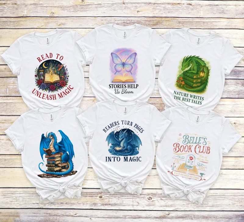 See allThis enchanting DTF transfer brings a beloved fantasy theme to life with its "Readers Turn Pages Into Magic" design. It features a charming blue dragon engrossed in an open book, surrounded by a subtle magical glow, stars, and a crescent moon. This captivating heat press design perfectly captures the wonder of imagination and storytelling, making it a must-have ready to press transfer for anyone finding magic in books. Ideal for avid readers, fantasy enthusiasts, librarians, teachers, and students, this design is a wonderful way to express a passion for literature and mythical creatures. It makes a fantastic gift for birthdays, holidays, or as a thoughtful present for book club members, aspiring authors, or anyone who cherishes the escape that reading provides. Spruce up your wardrobe or create personalized gifts that celebrate the magic of reading. Applying this vibrant t-shirt transfer is simple and efficient. Our high-quality DTF transfers work beautifully on a wide range of materials, including cotton, polyester, and various fabric blends. For best results, use a heat press at 300-325°F for 15 seconds with medium pressure, then cold peel the film. Alternatively, a household iron can also be used following specific instructions. Enjoy professional-looking results without the hassle of weeding. Crafted with professional-grade DTF film, this iron on decal boasts exceptional color vibrancy, ensuring your design truly pops. The print is highly crack-resistant, durable, and features a soft-to-touch finish that feels like part of the fabric. With strong adhesive, your new custom transfer will withstand countless washes, maintaining its magical appeal for years.