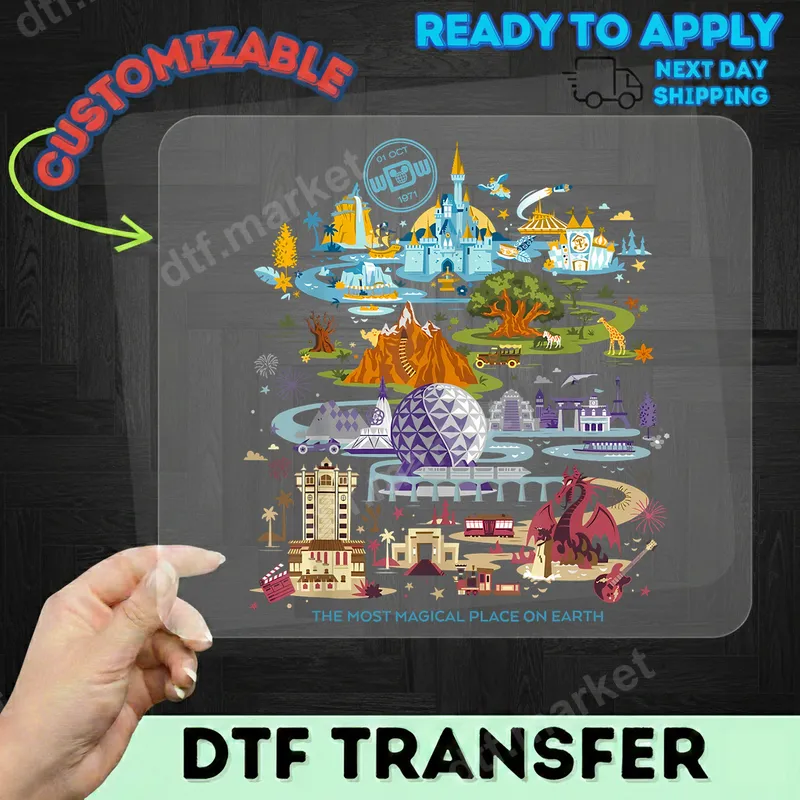 See allRelive the enchantment with this captivating theme park icons map DTF transfer. This vibrant, ready to press design beautifully illustrates beloved landmarks from the world's most magical destination, featuring an iconic castle, futuristic geodesic sphere, majestic tree of life, and a fiery dragon. It’s a detailed, illustrative style that captures the spirit of unforgettable family adventures. This premium direct to film transfer is perfect for adding fantasy to any garment. This heat transfer is ideal for anyone who dreams of magical getaways or wants to commemorate a special trip. Perfect for families planning a vacation, celebrating a birthday, or creating matching shirts for a group. It also makes a fantastic gift for theme park lovers, travel enthusiasts, or anyone who appreciates iconic pop culture designs. Show off your love for the most magical place on earth with a unique custom transfer. Applying this professional-grade apparel transfer is simple and efficient on cotton, polyester, and blends. For best results, use a heat press at 300-325°F for 15 seconds with medium, firm pressure. You can also use a household iron. Unlike traditional vinyl transfer, our iron on design requires no weeding, making customization quick and hassle-free. Experience superior quality with our DTF transfer, engineered for vibrant colors, exceptional durability, and a soft-to-touch feel. Each heat press design is printed on professional DTF film with strong adhesive, ensuring your design resists cracking, peeling, and fading wash after wash. Enjoy a long-lasting, high-quality finish that looks and feels professionally applied, bringing joy and magic to your wardrobe.