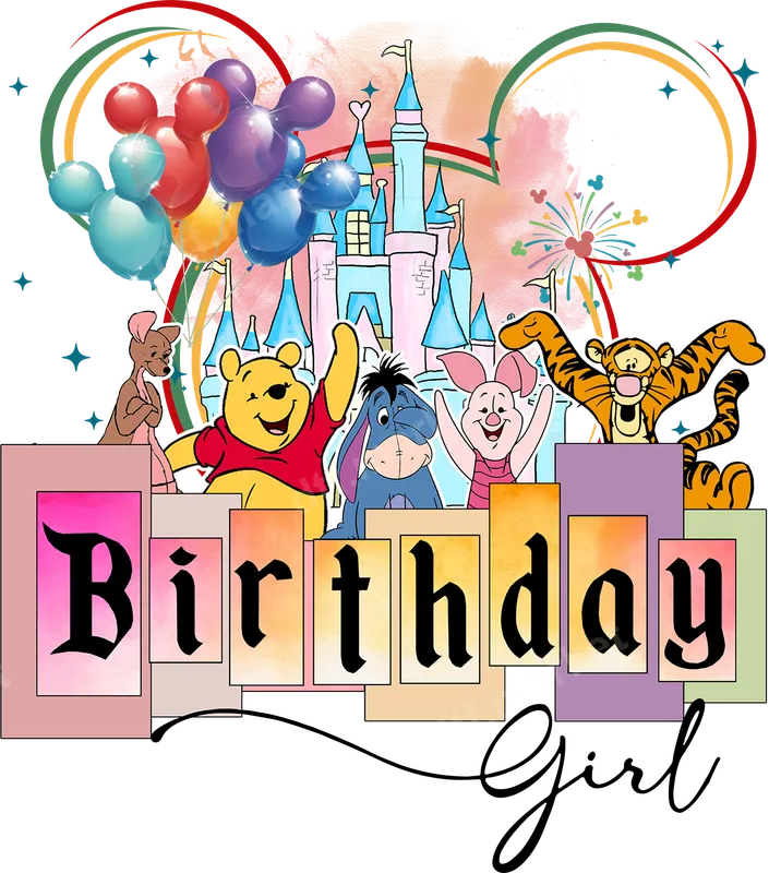 See allBring the magic of the Hundred Acre Wood to life with this enchanting 'Birthday Girl' DTF transfer! Featuring beloved characters Winnie the Pooh, Piglet, Eeyore, Tigger, and Kanga, this design sets a whimsical scene with a fairytale castle, vibrant Mickey ear balloons, and celebratory fireworks. The bold 'Birthday Girl' text, beautifully laid out on watercolor-style blocks, makes this a truly special ready to press design for any young one's big day. It's designed to bring a smile and a touch of magic to any garment. This delightful design is perfect for celebrating your little one's special day, especially for those who adore Winnie the Pooh and his friends. Create custom birthday shirts, party favors, or a memorable outfit for a themed birthday party or a trip to a magical theme park. It's also an excellent gift idea for any child who dreams of fairytales and fun adventures with their favorite characters. Make her birthday outfit truly unique and unforgettable. Applying your new apparel transfer is simple and straightforward. This heat transfer works beautifully on a wide range of materials, including cotton, polyester, and various fabric blends. For best results, use a heat press at 300-325°F for 15 seconds with medium pressure. Even if you don't have a heat press, a household iron can also be used following specific instructions. Unlike vinyl transfers, there's absolutely no weeding required, making your crafting process quick and enjoyable. You'll love the professional quality of our direct to film transfer. Each design boasts vibrant colors, exceptional detail, and a soft, smooth finish that feels great on any fabric. Our premium DTF film ensures your design is durable, crack-resistant, and won't fade with washing. With strong adhesive properties, this t-shirt transfer is built to last, providing a long-lasting, high-quality addition to any garment or accessory. Elevate your apparel with a transfer that truly stands out.