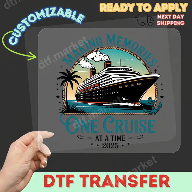 See allThis stunning DTF transfer features a classic cruise ship sailing under a warm, tropical sky, framed by a weathered rope and accented with an anchor and palm tree. The design proudly proclaims "MAKING MEMORIES ONE CRUISE AT A TIME * 2025 *", evoking a sense of adventure and cherished moments. This high-quality, ready to press transfer brings the excitement of a sea voyage directly to your apparel, capturing the spirit of unforgettable vacations. Perfect for cruise enthusiasts, family vacation groups, or friends planning a 2025 getaway, this heat transfer is ideal for creating matching shirts or souvenirs. Commemorate a special trip, celebrate a reunion, or simply express your love for ocean travel. It also makes a thoughtful gift for anyone dreaming of their next journey on the high seas, transforming everyday items into personalized mementos. Applying this iron on transfer is simple and efficient. It adheres beautifully to a wide range of materials, including cotton, polyester, and various fabric blends. For best results, use a heat press at 300-325°F for 15 seconds with medium pressure, then perform a cool peel. No complicated weeding or layering required, making it a hassle-free solution for professional-looking garments. Our premium DTF film ensures your custom transfer boasts incredibly vibrant colors and sharp details that truly pop. The design is engineered to be crack-resistant and flexible, providing a soft-to-touch feel on any garment. Experience the durability and superior quality of a professional heat press transfer, designed to withstand numerous washes while maintaining its pristine appearance.