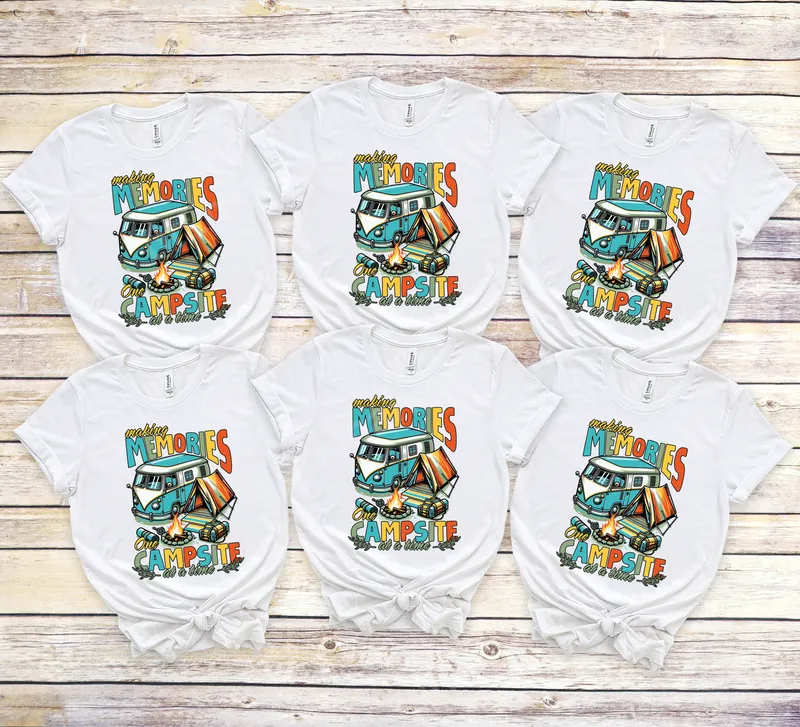 See allEmbrace the spirit of adventure with this vibrant 'Making Memories One Campsite At A Time' DTF transfer. Featuring a classic retro camper van, a cozy camping tent, and a warm campfire scene, this design evokes a sense of nostalgia and wanderlust. It's a perfect ready to press design for anyone who loves the great outdoors and creating lasting memories. This high-quality direct to film transfer is sure to make your apparel stand out. This charming heat transfer is ideal for camping enthusiasts, road trippers, and families planning their next outdoor getaway. Create matching family shirts for your next vacation, unique gifts for RV owners, or personalized apparel for a summer festival. It’s also a fantastic iron on decal for making custom gifts for birthdays, Father's Day, or any occasion celebrating adventure and togetherness. Applying this professional heat press transfer is simple and efficient. Our DTF transfers work beautifully on a wide range of fabrics, including cotton, polyester, and various blends. For best results, use a heat press at 300-325°F for 15 seconds with medium pressure. It can also be applied with a household iron with careful technique. Enjoy a hassle-free application process with no weeding required, making custom apparel creation quick and easy. Experience superior quality with our durable heat press designs. Each ready to press transfer delivers exceptionally vibrant colors and sharp details that resist cracking and peeling, even after multiple washes. The premium DTF film ensures a soft hand feel and a strong, long-lasting adhesion to your chosen garment. Transform your t-shirts, hoodies, and accessories with a professional finish that truly lasts.