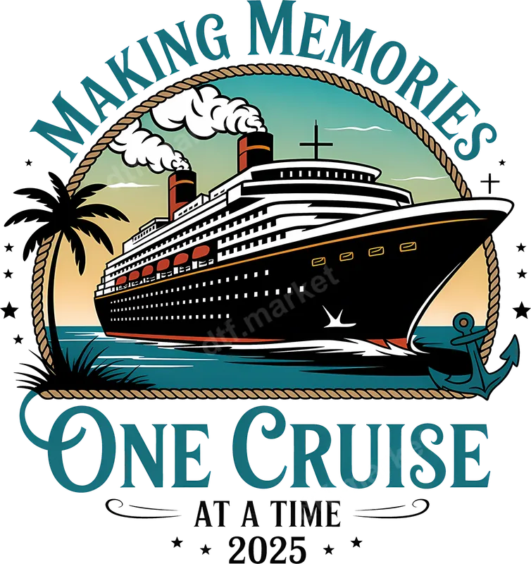 See allThis vibrant DTF transfer features a classic cruise ship sailing across a scenic ocean backdrop, framed by a nautical rope and adorned with a palm tree and anchor. The bold text "MAKING MEMORIES ONE CRUISE AT A TIME" captures the spirit of travel and adventure, with "2025" clearly marked for a memorable trip. This ready to press design evokes nostalgia and excitement for upcoming voyages, making it a perfect statement piece for your next journey. Ideal for anyone planning a cruise vacation, celebrating a milestone trip in 2025, or simply dreaming of ocean adventures. This versatile design makes fantastic custom apparel for family cruise reunions, couples' getaways, or group excursions. It's also a thoughtful gift for avid cruisers or travel lovers looking to commemorate their journeys. Create matching shirts for your travel crew or a unique souvenir for yourself. Applying this heat press transfer is a breeze, compatible with a wide range of materials including cotton, polyester, and various blends. For best results, use a heat press at 300-325°F for 15 seconds with medium pressure, then perform a cool peel. Alternatively, a household iron can be used following specific instructions. Unlike traditional vinyl transfer methods, there's no tedious weeding required – just press and go! This makes it a perfect iron on transfer for crafters and businesses alike. Our direct to film transfer ensures stunning, vibrant colors that stand out on any garment. The high-quality professional DTF film provides excellent durability, resisting cracks and peels, even after multiple washes. You'll appreciate the soft hand feel, making your customized apparel comfortable to wear. With strong adhesive properties, this t-shirt transfer creates a professional-looking finish that lasts, making it a premium choice for all your custom apparel needs.