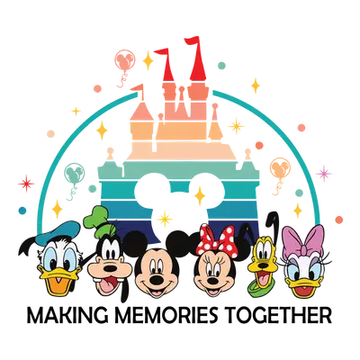 See allThe design features a charming, retro-style castle silhouette with a vibrant rainbow-striped effect, accented by a subtle Mickey-shaped cutout. Below the magical castle stand the cheerful faces of beloved cartoon friends – Donald Duck, Goofy, Mickey Mouse, Minnie Mouse, Pluto, and Daisy Duck – radiating joy and camaraderie. The playful stars, balloons, and dots enhance the whimsical atmosphere, perfectly complementing the heartwarming phrase "MAKING MEMORIES TOGETHER" beneath. This nostalgic DTF transfer is truly a ready to press design that evokes feelings of fun, friendship, and cherished moments. This delightful design is perfect for families planning a magical vacation, groups celebrating a special trip, or friends wanting matching apparel. It makes an ideal iron on transfer for crafting personalized gifts for birthdays, family reunions, or as a thoughtful gesture for anyone who loves classic animation. Etsy t-shirt sellers, small boutique owners, and crafters looking for high-quality heat transfer designs to create unique merchandise will find this graphic irresistible. It’s also fantastic for creating matching outfits for kids and adults heading to theme parks or themed parties. Applying this heat press transfer is simple and efficient. It works beautifully on a wide range of fabrics, including cotton, polyester, cotton-poly blends, and even nylon. For best results, use a heat press at 300-325°F for 15 seconds with medium pressure, or apply with a household iron following similar temperature and pressure guidelines. There's no tedious weeding required – just peel and press! This design is perfect for custom t-shirts, cozy hoodies, stylish sweatshirts, practical tote bags, fun pillow covers, cute baby onesies, playful aprons, and trendy denim jackets. To ensure lasting durability, wash garments inside out and tumble dry low. Experience exceptional quality with this ready to press transfer. It boasts vibrant, full-color printing with incredibly fine detail, ensuring every character and castle element pops. The design is crack-resistant and offers a soft-to-the-touch feel, avoiding the heavy, stiff texture often associated with vinyl transfers. Each direct to film transfer is meticulously printed on premium DTF film, featuring a strong adhesive backing for professional, long-lasting results that you and your customers will adore.