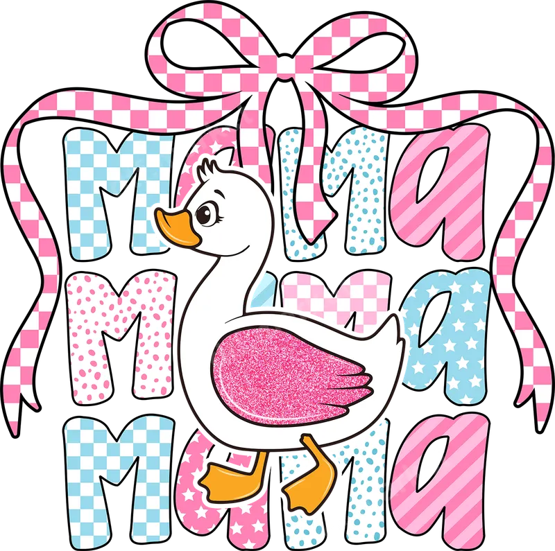 See allThis charming DTF transfer features an endearing white goose with a dazzling pink glitter-like body, playfully waddling over a vibrant background of 'Mama' text. The letters are adorned with an array of cheerful patterns, including pink and blue checkerboard, polka dots, stripes, and stars, all crowned by a whimsical pink and white checkered ribbon bow. This ready to press design encapsulates a sweet and loving tribute to mothers, making it an instant favorite for anyone who cherishes family and a touch of sparkle. Perfect for new mothers, grandmothers, or anyone celebrating a special maternal figure, this versatile design makes an excellent heat transfer for Mother's Day, baby showers, or birthday gifts. It's an ideal choice for creating custom apparel for family gatherings, everyday wear, or thoughtful presents that show appreciation for the 'Mama' in your life. Surprise your mom, aunt, or grandma with a unique iron on transfer that's both stylish and heartfelt. Applying this professional DTF transfer is effortless, ensuring a flawless finish on a wide range of materials. It works beautifully on cotton, polyester, and various fabric blends. For best results, use a heat press at 300-325°F for 15 seconds with medium pressure, then peel cold. If you don't have a heat press, a household iron can also be used with careful application. Forget about weeding or layering – this heat press ready design simplifies your customization projects. Crafted with premium DTF film and strong adhesive, our direct to film transfers boast exceptional quality. Enjoy vibrant, true-to-color prints that are remarkably soft to the touch, highly durable, and crack-resistant, even after numerous washes. This t-shirt transfer ensures your personalized garments will look fantastic and last, providing a professional-grade finish that rivals traditional screen printing without the hassle. Create durable and beautiful shirt designs with ease.