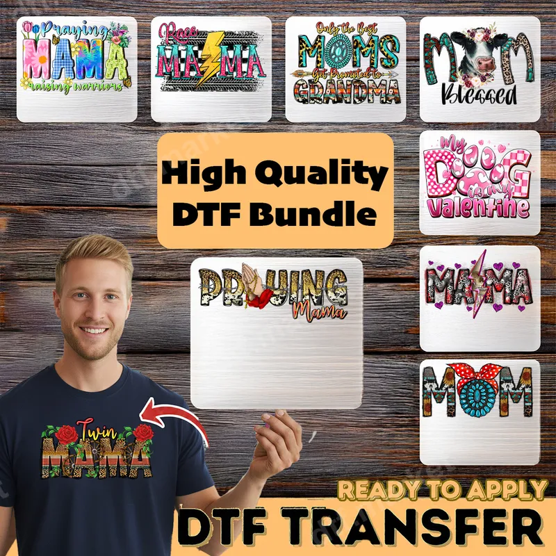 See allThe Mama & Mom DTF Transfer Bundle offers a diverse collection of heat-press-ready designs celebrating mothers, grandmas, and even dog moms. This vibrant bundle features a range of styles including rustic leopard print, floral accents, distressed textures, and empowering typography. Each design, from "Praying Mama" to "Twin Mama" and "Only the Best Moms Get Promoted to Grandma," is expertly crafted to provide a unique touch to any garment. These high-quality DTF transfers are ready to press directly onto your chosen fabric, making customization simple and fun. This versatile collection of direct to film transfers is perfect for anyone looking to celebrate the special women in their life. Whether for Mother's Day, birthdays, baby showers, or just everyday appreciation, these designs make thoughtful gifts. Crafters, small business owners, and individuals wanting to personalize apparel for family events or casual wear will find endless possibilities. The inclusion of designs like "My Dog is my Valentine" also caters to pet-loving moms, making it ideal for unique holiday creations or year-round wear. Applying these apparel transfers is incredibly straightforward, whether you use a professional heat press or a household iron. They adhere perfectly to a wide range of materials, including 100% cotton, polyester, cotton/poly blends, and even triblends. For best results with a heat press, apply at 300-325°F for 15 seconds with medium pressure. No complicated weeding or layering like traditional vinyl transfers – simply press and peel! These iron on decals offer professional results with minimal effort. Each t-shirt transfer in this bundle is produced using premium DTF film and vibrant, crack-resistant inks, ensuring a soft feel and lasting durability. The colors pop beautifully, maintaining their integrity wash after wash. Our heat press designs are engineered for a strong, reliable bond with your fabric, providing a professional finish that will not fade or crack. Enjoy the confidence of a high-quality, ready to press transfer that stands the test of time.