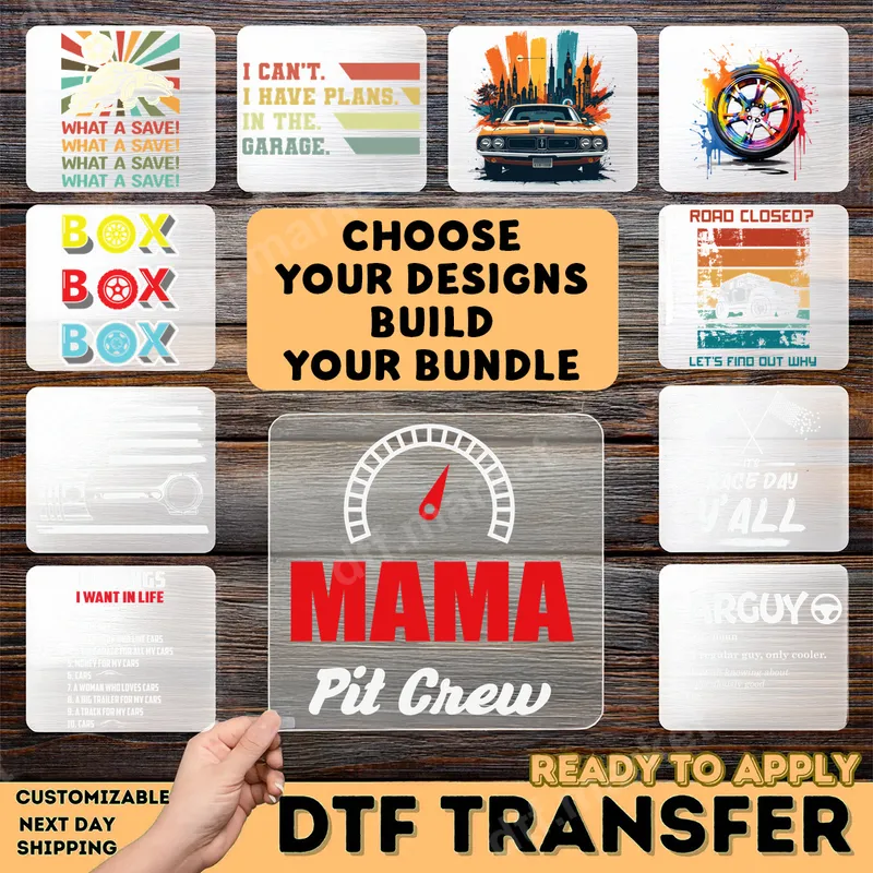 See allRev up your style with this dynamic Mama Pit Crew DTF transfer! Featuring bold red 'MAMA' text, 'Pit Crew' in a complementary font, and a classic speedometer gauge, this design is perfect for the mom who lives life in the fast lane. This high-quality, ready to press heat transfer brings professional-grade customization right to your home or shop. This eye-catching iron on design is ideal for proud racing moms, car show enthusiasts, or anyone who supports their family's passion for motorsports. It makes a fantastic gift for Mother's Day, birthdays, or just because you appreciate the ultimate trackside support. Whether you're at the drag strip, a local race, or simply running errands, this t-shirt transfer lets everyone know you're part of the team. Applying your Mama Pit Crew design is simple and efficient. Our DTF transfers work beautifully on a wide variety of fabrics, including cotton, polyester, and cotton/poly blends. For best results, use a heat press at 300-325°F for 15 seconds with medium, even pressure. Unlike traditional vinyl transfer, there's no weeding required – just press and peel! Detailed instructions are included with every order for a flawless finish. Experience the superior quality of dtf.market's heat press ready transfers. This design boasts vibrant colors that pop, exceptional durability, and resistance to cracking or fading after washes. The soft-touch finish ensures maximum comfort, feeling like part of the fabric. Trust our professional DTF film for long-lasting, high-impact results on all your custom creations.