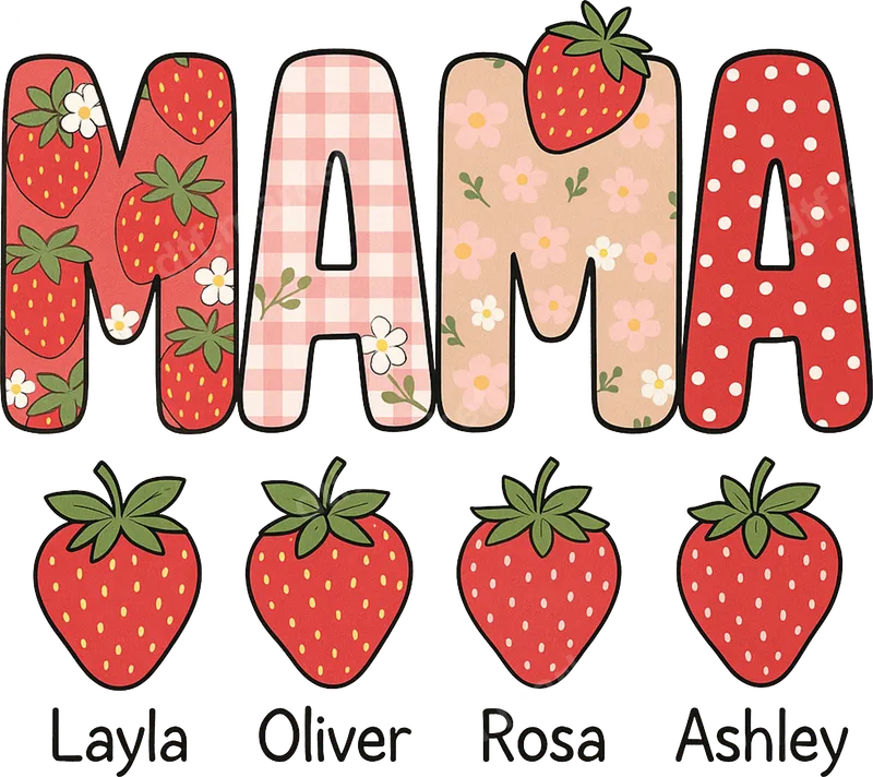 See allThis charming DTF transfer features the word "MAMA" crafted with delightful patterns: sweet strawberries, classic gingham, delicate florals, and playful polka dots, creating a warm and personalized design. Below "MAMA," up to four individual strawberries are accompanied by custom names, making it a truly unique piece. This ready to press transfer brings a fresh, heartwarming, and slightly rustic vibe, perfect for any loving mother who wants to showcase her family. This design is ideal for proud mothers, grandmothers, or aunts who cherish their family. It makes an exceptional gift for Mother's Day, birthdays, Christmas, or just because. Perfect for family reunions, casual everyday wear, or special occasions celebrating the bond between a mother and her children. Imagine it on a cozy sweatshirt for a cool fall day or a light tee for a summer outing – a thoughtful way to carry loved ones close. Our premium heat transfer works flawlessly on a wide range of fabrics, including cotton, polyester, and various blends, ensuring versatility for your projects. Applying this heat press design is simple: use a heat press at 300-325°F for 15 seconds with medium pressure, or follow instructions for a household iron. Best of all, there's no tedious weeding required, making your crafting process quick and enjoyable. Experience superior quality with our vibrant, crack-resistant DTF transfers. Each image boasts excellent color fidelity and a soft, comfortable feel on any garment, ensuring lasting wear without stiffness. Crafted using professional-grade DTF film with a strong adhesive, these iron on decals are designed for durability and a smooth finish, maintaining their charm wash after wash.