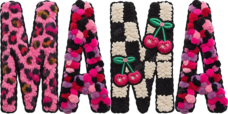 See allThis vibrant 'MAMA' DTF transfer brings a playful and stylish texture to any garment. The design showcases each letter with a unique, plush aesthetic: the first 'M' features a chic pink leopard print, followed by an 'A' adorned with colorful pom-poms. The second 'M' stands out with a trendy black and white checkerboard pattern accented with adorable embroidered cherries, while the final 'A' completes the look with more cheerful pom-poms. This high-quality, ready to press DTF transfer is perfect for adding a cozy yet fashionable touch to your apparel projects. Celebrate the amazing moms in your life with this unique heat transfer. It’s an ideal choice for Mother's Day gifts, baby showers, or simply to show appreciation for any mom, grandma, or expecting mother. Whether you’re creating custom t-shirts, sweatshirts, or tote bags, this design is perfect for new moms, seasoned matriarchs, or anyone who embodies the 'mama' spirit. It also makes a fantastic iron on decal for personalized gifts, expressing love and style. Our premium DTF transfers are incredibly versatile and easy to apply to a wide range of fabrics, including cotton, polyester, and cotton-poly blends. For best results, use a heat press at 300-325°F for 15 seconds with medium, even pressure. This heat press design ensures a professional finish every time. Unlike traditional vinyl transfer methods, there's absolutely no weeding required, saving you time and effort. You can even use a household iron, making it accessible for crafters of all skill levels. Experience superior quality with our direct to film transfer technology. These transfers are designed to be incredibly vibrant, ensuring your colors pop and stay true wash after wash. They are highly crack-resistant and offer a remarkably soft feel on the fabric, integrating seamlessly with your garment. Crafted using professional-grade DTF film and strong adhesive, our heat press ready designs provide exceptional durability and longevity, making your custom creations last.
