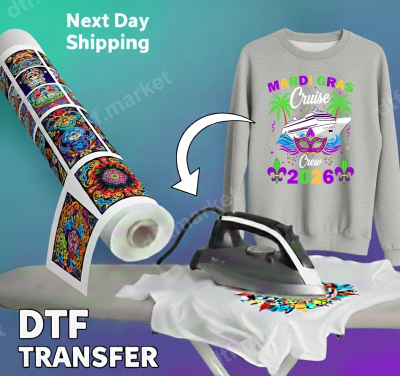 See allCelebrate your upcoming Mardi Gras Cruise with this vibrant and festive DTF transfer. Featuring a lively cruise ship, iconic Mardi Gras mask, festive palm trees, and bold 'Mardi Gras Cruise Crew 2026' lettering, this ready to press design perfectly captures the spirit of celebration and group travel. The design pops with traditional purple, green, and gold colors, ready to bring your custom apparel to life for an unforgettable vacation experience. This eye-catching heat transfer is ideal for anyone planning a Mardi Gras cruise in 2026, especially groups, families, or friends traveling together. Create matching t-shirts for your whole crew, unique tote bags, or special souvenirs. It's perfect for pre-cruise parties, onboard events, or as a thoughtful gift for fellow cruisers and travel enthusiasts looking for custom apparel that stands out. Applying this iron on transfer is simple and efficient, making it accessible for everyone. Designed for easy application, it works beautifully on a wide variety of materials including cotton, polyester, and most fabric blends. For best results, use a heat press at 300-325°F for 15 seconds with medium pressure, then perform a cold peel. A household iron can also be used with careful, even pressure. No weeding required, making custom garment creation a breeze. Our premium DTF transfers boast incredibly vibrant colors and exceptional durability. The specialized direct to film transfer technology ensures a soft hand feel that won't crack, peel, or fade, even after multiple washes. Enjoy professional-grade results with every heat press design, turning ordinary apparel into standout pieces that last. This durable t-shirt transfer is built to impress.
