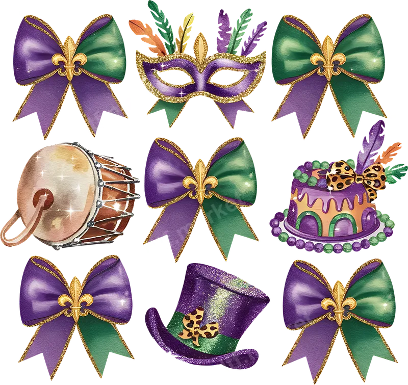 See allDive into the festive spirit with our vibrant Mardi Gras Festival Elements DTF transfer collection. This ready to press design features classic New Orleans symbols like sparkling purple and green bows adorned with golden fleur-de-lis, a glittery masquerade mask, a traditional drum, a festive cake, and a snazzy top hat. Each direct to film transfer element captures the joyous, celebratory vibe of Carnival with rich colors and a touch of glitter, making it perfect for custom apparel. This festive heat press transfer kit is ideal for anyone looking to add a touch of Mardi Gras magic to their wardrobe or party gear. Perfect for parades, themed parties, New Orleans trips, or simply showing off your love for the vibrant holiday. These versatile iron on designs make fantastic gifts for friends and family celebrating Fat Tuesday, or for small businesses creating unique Mardi Gras merchandise and apparel. Applying your new apparel transfer is simple and efficient. Our DTF transfers work seamlessly on a wide range of fabrics including cotton, polyester, and various blends. For best results, use a heat press at 300-325°F for 15 seconds with medium, even pressure. This heat press design requires no weeding, making your customization process quick and hassle-free, delivering a professional finish every time. Experience premium quality with every application. Our professional-grade DTF transfer film ensures your designs are incredibly vibrant, crack-resistant, and have a soft, lightweight feel on any garment. The strong adhesive provides excellent durability, ensuring your festive Mardi Gras designs last wash after wash. Transform your garments into celebratory masterpieces with these high-quality, long-lasting direct to film transfers.