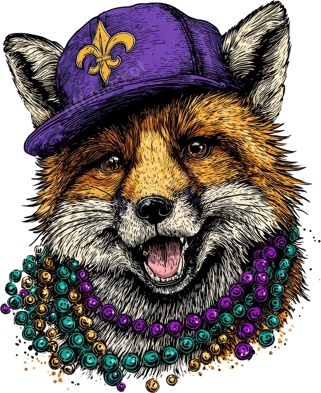 Mardi Gras Fox DTF Transfer | Fleur-de-lis Hat & Beads Design