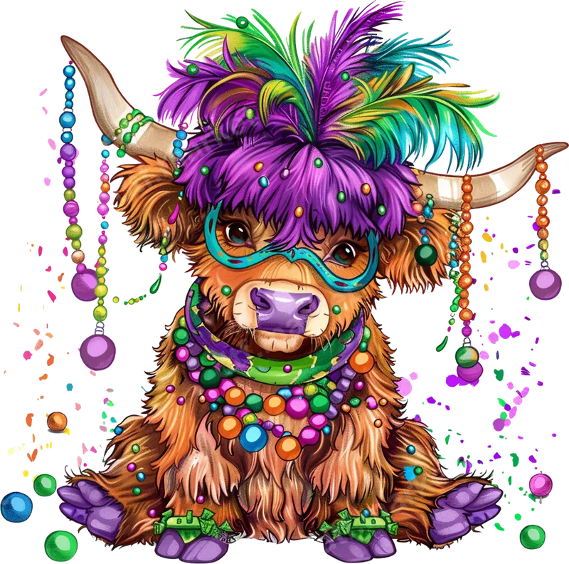 Mardi Gras Highland Cow DTF Transfer | Festive Animal Design