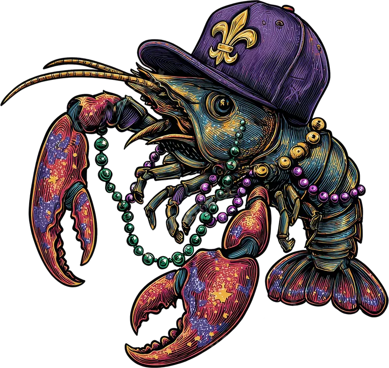Mardi Gras Lobster DTF Transfer | Fleur-De-Lis Hat & Beads Design