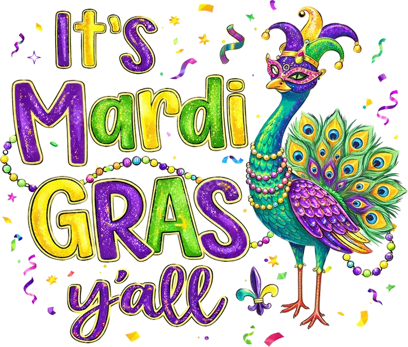 Mardi Gras Peacock Y'all DTF Transfer | Festive Apparel Design