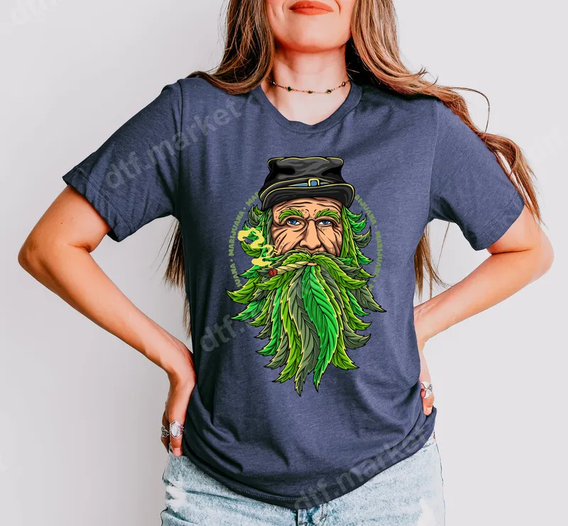 See allThis vibrant DTF transfer features a distinctive leprechaun-like character, sporting a lush beard crafted entirely from marijuana leaves and wearing a black hat. With a joint lit and green smoke swirling around his face, this design is encircled by repeated "MARIJUANA" text, creating an unmistakably edgy and playful vibe. It’s a premium, ready to press transfer that promises to make a bold statement. Perfect for cannabis enthusiasts, St. Patrick's Day revelers, or anyone celebrating 4/20, this unique heat press design makes an excellent gift or a standout addition to your personal apparel collection. Whether you're attending a festival or just expressing your style, this heat press design is sure to spark conversations and turn heads. Applying this stunning design is simple and hassle-free, working perfectly on a wide range of materials including cotton, polyester, and their blends. Use a heat press at 300-325°F for 15 seconds with medium pressure, or even a household iron for smaller applications, making it a versatile iron on transfer. As a ready to press transfer, there's no tedious weeding required, making your customization project quick and easy. Crafted with professional-grade DTF film, this t-shirt transfer ensures vibrant colors that resist cracking and fading, maintaining their brilliance wash after wash. The strong adhesive provides a durable bond, while the transfer itself is soft to the touch, integrating seamlessly with your garment for a high-quality, long-lasting finish.