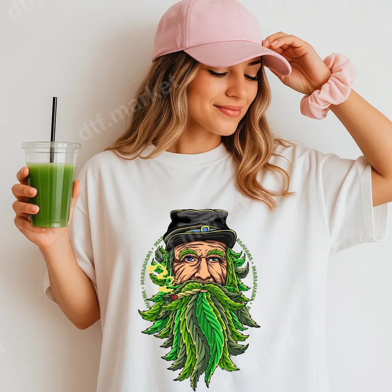 See allThis vibrant DTF transfer features a unique character – a rugged man sporting a lush beard made entirely of marijuana leaves, complete with a lit joint and a casual cap. The design is encircled by repeating "MARIJUANA" text, creating a bold statement piece that's sure to turn heads. It's a high-quality, ready to press heat transfer that brings a distinctive edge to any garment, perfect for those who appreciate cannabis culture and a touch of adult humor. This eye-catching design is ideal for cannabis enthusiasts, recreational users, and anyone with a laid-back, humorous style. Perfect for 4/20 celebrations, music festivals, casual outings, or as a witty birthday gift for friends who enjoy a good smoke. It makes a fantastic custom transfer for personalizing gifts or creating unique merchandise for cannabis-themed events. Applying this heat press design is incredibly simple. Our DTF transfers work seamlessly on a wide range of fabrics, including 100% cotton, polyester, and various blends. For best results, use a heat press at 300-325°F for 15 seconds with medium pressure. It can also be applied with a high-quality household iron, following similar temperature and pressure guidelines. There's no complicated weeding required, making your customization process quick and hassle-free. Experience professional-grade quality with every iron on decal. Our direct to film transfers boast incredibly vibrant colors that pop, superior crack-resistant durability, and a remarkably soft feel on your garment. Each t-shirt transfer is produced using premium DTF film and strong adhesive, ensuring your design adheres beautifully and lasts through countless washes, maintaining its original appeal.