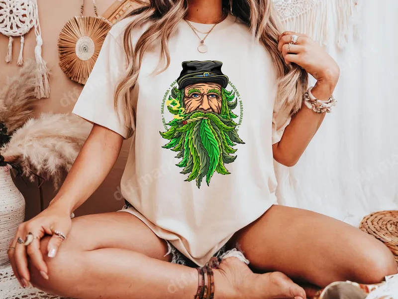 See allThis vibrant DTF transfer features a humorous St. Patrick's Day leprechaun, with a lush beard made of marijuana leaves. Sporting a black cap and casually puffing on a joint, this design blends festive fun with cannabis culture. It's a ready to press design that makes a bold statement, perfect for those who appreciate edgy humor and quality apparel transfers. This eye-catching heat press design is ideal for adults celebrating St. Patrick's Day with a twist, cannabis enthusiasts, or anyone who enjoys witty, irreverent humor. It makes a fantastic gift for friends who appreciate unique weed-themed apparel or for personalizing your own wardrobe for festivals, parties, or casual wear. Stand out at your next gathering or give a memorable present that's sure to spark conversation. Applying this design is simple and hassle-free. Our premium heat press transfer works beautifully on a wide range of fabrics, including 100% cotton, polyester, and various blends. For best results, use a heat press at 300-325°F for 15 seconds with medium pressure. Even if you don't have a professional press, excellent results can be achieved with a household iron. Enjoy the convenience of a "no weeding" iron on decal – just press and peel! Crafted using high-quality DTF film and advanced printing, this apparel transfer ensures stunning vibrancy and durability. Your finished garment will feature a design that is soft to the touch, crack-resistant, and built to withstand numerous washes without fading or peeling. The strong adhesive provides a lasting bond, making it an excellent choice for creating professional-looking custom shirts, hoodies, and bags. Experience superior quality with every transfer.