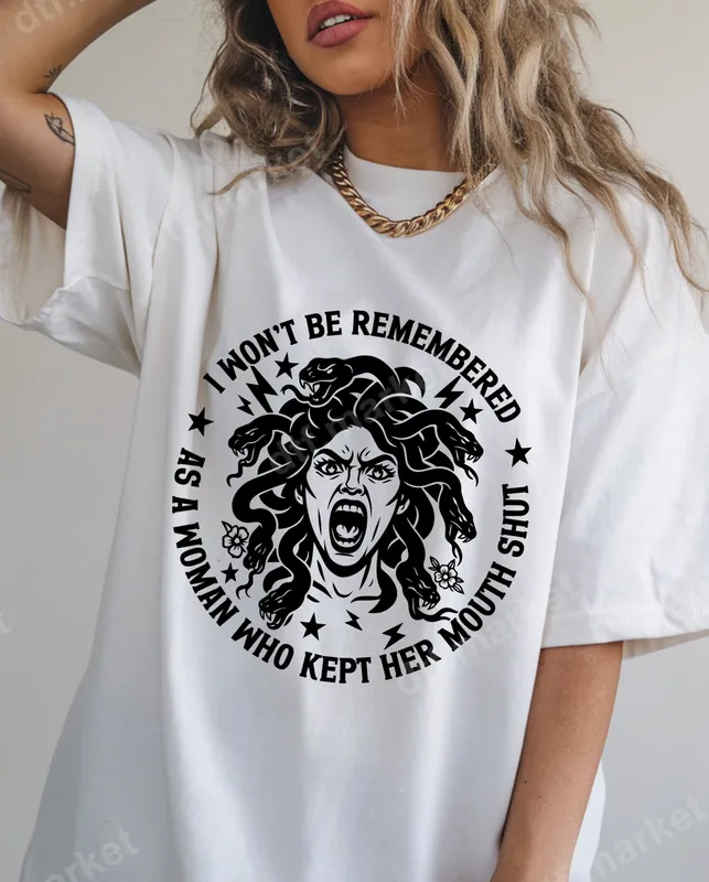 See allUnleash your inner strength with this striking Medusa DTF transfer, featuring a powerful depiction of the mythical gorgon with an enraged expression, surrounded by coiling snakes and subtle floral accents. The bold circular text reads, 'I WON'T BE REMEMBERED AS A WOMAN WHO KEPT HER MOUTH SHUT,' framed by stars and lightning bolts. This ready to press design embodies fierce independence and a refusal to be silenced, perfect for any garment. This unique heat transfer is perfect for anyone who stands up for themselves and others, an ideal expression for feminists, activists, and women who aren't afraid to speak their minds. It makes an empowering gift for a friend, sister, or mother, or a powerful addition to your own wardrobe for everyday wear, rallies, or social events. Show the world you're a force to be reckoned with and won't be silenced. Applying this apparel transfer is simple and efficient. Our high-quality direct to film transfers adhere beautifully to a wide range of materials, including cotton, polyester, and their blends. For best results, use a heat press at 300-325°F for 15 seconds with medium pressure, then cold peel. A household iron can also be used with careful application. Enjoy a professional finish without any tedious weeding, unlike traditional vinyl transfer applications. Experience superior durability and vibrant color that lasts wash after wash. Our ready to press transfers are crafted using premium DTF film and high-grade inks, ensuring a soft, flexible feel that won't crack or peel. Each iron on transfer provides a smooth finish, perfect for creating custom shirts, bags, and more that truly make an impact. Elevate your apparel with a design that speaks volumes.