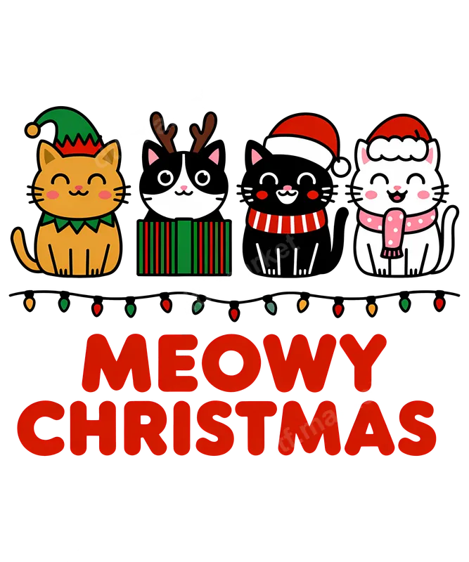 See allCelebrate the festive season with our charming 'Meowy Christmas' DTF transfer! This delightful design features four adorable cartoon cats, each dressed in unique holiday attire: an elf cat, a reindeer cat peeking from a gift, a Santa cat with a scarf, and another Santa cat with a pink scarf. Below these cheerful felines, a string of colorful Christmas lights adds to the festive glow, alongside bold red 'MEOWY CHRISTMAS' text. This vibrant, ready to press heat transfer captures the playful spirit of Christmas for any cat enthusiast. This unique apparel transfer is ideal for cat parents, pet owners, and anyone who loves puns and festive style. It's perfect for creating custom holiday outfits, adding a personal touch to Christmas party wear, or making thoughtful DIY gifts for friends and family. Envision matching family t-shirts for holiday photos or a special mug for a secret Santa. This iron on transfer adds a cozy, humorous touch to any festive gathering. Our premium DTF transfers are incredibly versatile, applying flawlessly to cotton, polyester, and various fabric blends. For best results, use a heat press at 300-325°F for 15 seconds with medium pressure. A household iron can also be used with care. This heat press ready design requires no weeding, making your custom transfer process quick and enjoyable. Experience professional-grade results with our high-quality direct to film transfer. Each design boasts vibrant, crack-resistant colors and a soft, comfortable feel on fabric. Our durable DTF film with strong adhesive guarantees your shirt design will withstand countless washes and wear, looking fantastic for seasons to come.