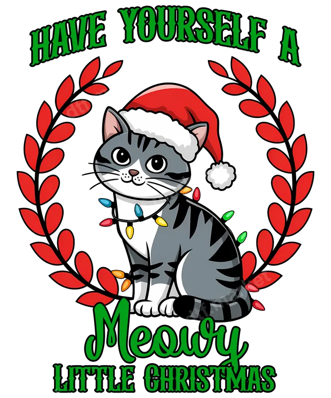 See allDive into the holiday spirit with our adorable "Have Yourself A Meowy Little Christmas" DTF transfer, featuring a charming tabby cat playfully tangled in colorful festive lights and sporting a classic Santa hat, all encircled by a vibrant red wreath. This delightful design captures the purr-fect blend of feline charm and holiday cheer, making it an irresistible ready to press addition for your seasonal apparel and accessories. This unique heat press design is ideal for cat parents, Christmas enthusiasts, and anyone who loves a good pun or cute animal graphics. It’s perfect for crafting personalized gifts, creating matching family holiday shirts, or adding a touch of whimsical joy to your own festive wardrobe. Great for Christmas parties, holiday gatherings, or simply spreading cheer throughout the winter season. Applying this vibrant heat transfer is straightforward and hassle-free. Our high-quality DTF transfers work beautifully on a wide variety of fabrics, including cotton, polyester, and blends. For best results, use a heat press at 300-325°F for 15 seconds with medium pressure, then peel cold. A household iron can also be used with care. Enjoy the convenience of no weeding or masking required – just press and go! Experience professional-grade results with every application. Our direct to film transfer technology ensures brilliant, true-to-color designs that are exceptionally durable, crack-resistant, and boast a soft, smooth feel on any garment. Each iron on transfer is crafted from premium DTF film with a strong, flexible adhesive, guaranteeing your custom creations will look fantastic and last through countless washes.