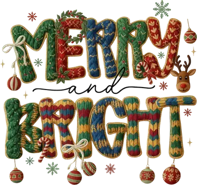 Merry and Bright Knitted Christmas DTF Transfer | Festive Reindeer & Ornaments