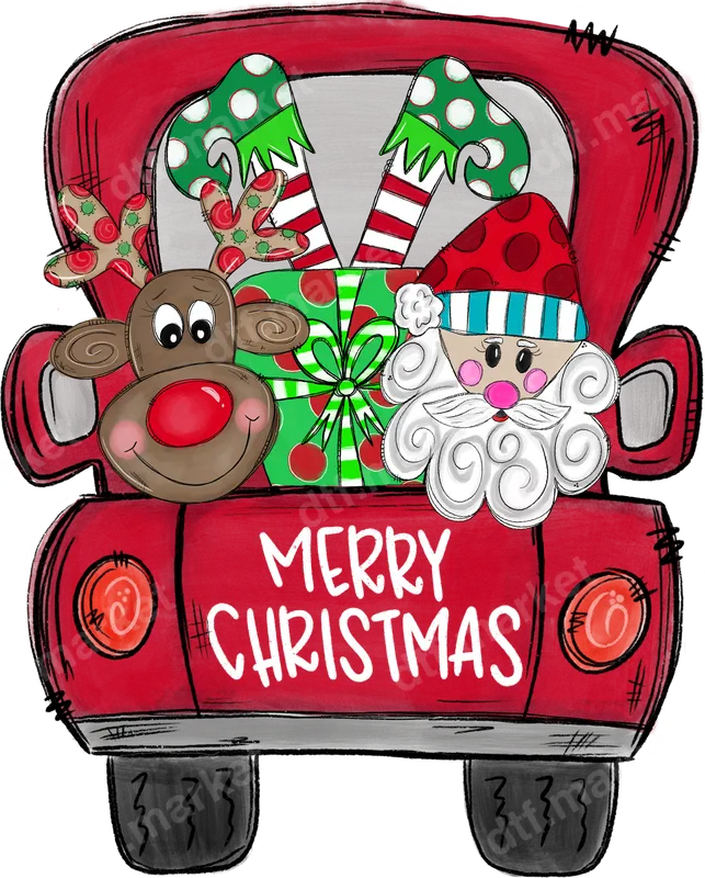 Merry Christmas Red Truck DTF Transfer with Santa & Reindeer
