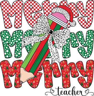 Merry Merry Merry Teacher Christmas DTF Transfer | Festive Pencil Design