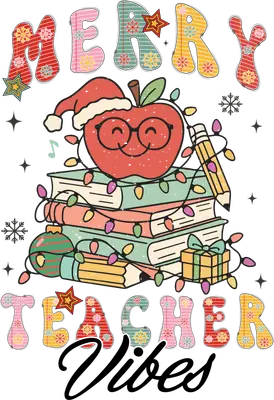 Merry Teacher Vibes DTF Transfer - Christmas Apple Books Design