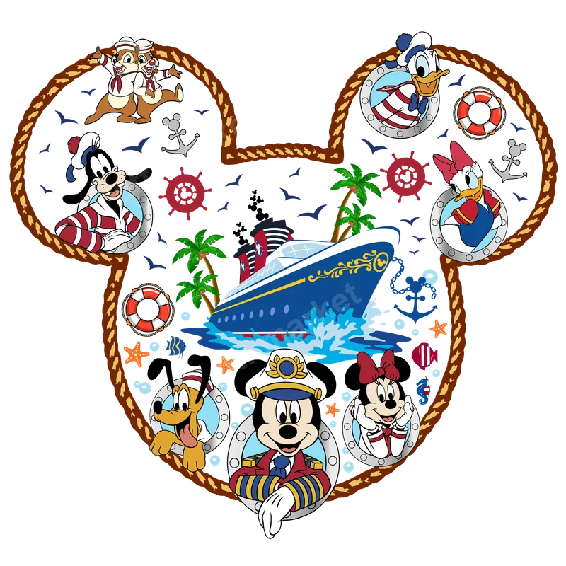 See allThis vibrant DTF transfer showcases Captain Mickey Mouse, Minnie, Donald, Daisy, Goofy, Pluto, and Chip 'n' Dale on a magical cruise adventure. The cheerful, ready to press design features a grand ship sailing the open seas, surrounded by palm trees, anchors, and seagulls. All elements are charmingly framed within a classic Mickey Mouse silhouette, outlined with a sturdy rope. It’s a delightful design bringing the joy of Disney and sea travel to life. This Mickey & Friends cruise heat transfer is perfect for anyone planning a family vacation, a Disney Cruise Line trip, or simply dreaming of a getaway. It makes a fantastic gift for Disney enthusiasts, cruise lovers, or families celebrating a reunion or special event. Create matching shirts for your travel group, memorable keepsakes for a birthday, or just a fun everyday tee. Applying this high-quality iron on transfer is simple and hassle-free. Our heat press ready transfers work perfectly on a wide range of fabrics including cotton, polyester, and various blends. For best results, apply with a heat press at 300-325°F for 15 seconds with medium pressure, then cool peel. A household iron can also be used. No weeding required, making customization quick and easy. Experience superior quality with our apparel transfers. Each direct to film transfer boasts incredibly vibrant colors, exceptional durability, and a soft, smooth finish that won't crack or fade. Made with professional-grade DTF film and a strong adhesive, these shirt designs ensure your custom creations look fantastic and last through countless adventures and washes.