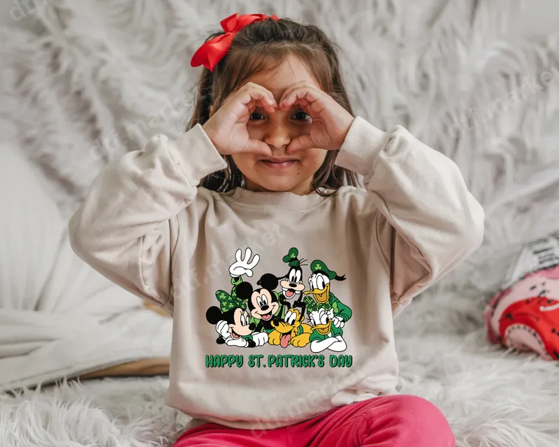 See allThis festive DTF transfer features Mickey Mouse, Minnie Mouse, Goofy, Donald Duck, and Pluto, all adorned in cheerful green St. Patrick's Day attire with shamrocks and leprechaun hats. Below the beloved characters, "HAPPY ST. PATRICK'S DAY" is displayed in vibrant green. This delightful direct to film transfer is ready to press, offering a perfect way to celebrate the luck of the Irish with iconic Disney magic. This charming design is ideal for Disney fans of all ages, perfect for kids, families, and anyone adding magic to St. Patrick's Day celebrations. Create unique matching family shirts for parades, gatherings, or school events. It also makes a fantastic gift for friends or loved ones who adore these classic characters and the festive spirit of the holiday. Applying this high-quality heat transfer is simple, suitable for cotton, polyester, and fabric blends. For best results, use a heat press at 300-325°F for 15 seconds with medium pressure, then peel cold. A household iron can also be used. No weeding is required for this custom transfer, saving you time and effort. Our DTF transfers use professional-grade film and strong adhesive, guaranteeing vibrant, crack-resistant colors and excellent durability. These heat press ready designs feel soft to the touch and maintain integrity wash after wash. Transform ordinary apparel into personalized masterpieces with this durable and easy-to-use t-shirt transfer.